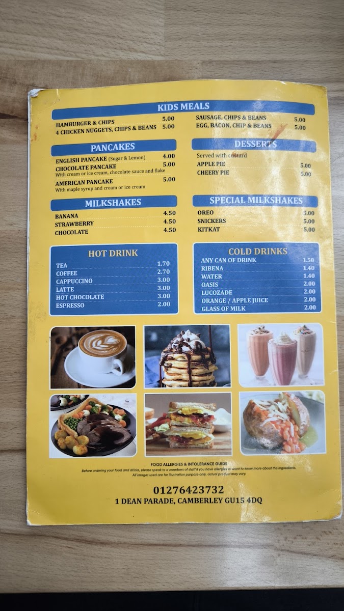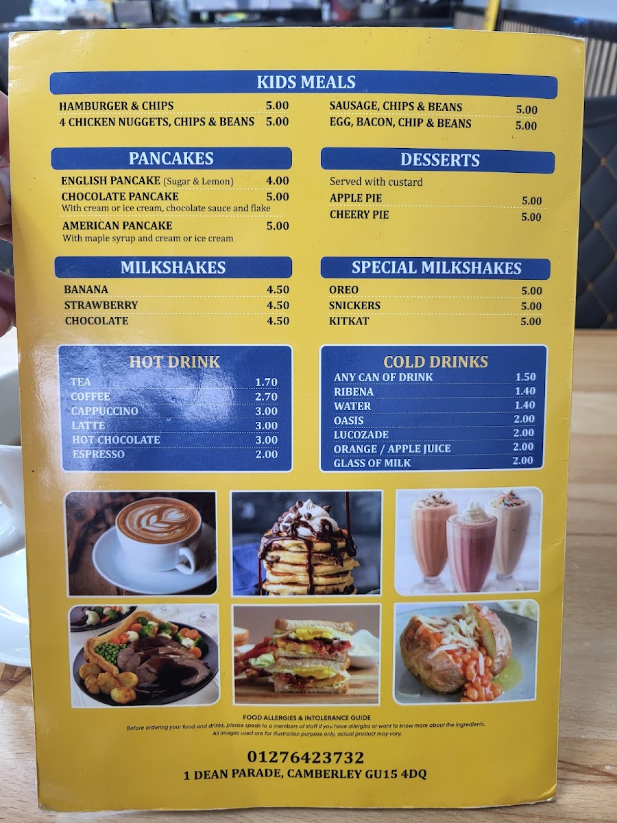 - Breakfast and Light Bites: This section features classic breakfast items such as the English Breakfast, bacon sandwiches, scrambled eggs with bacon, and other quick morning options.